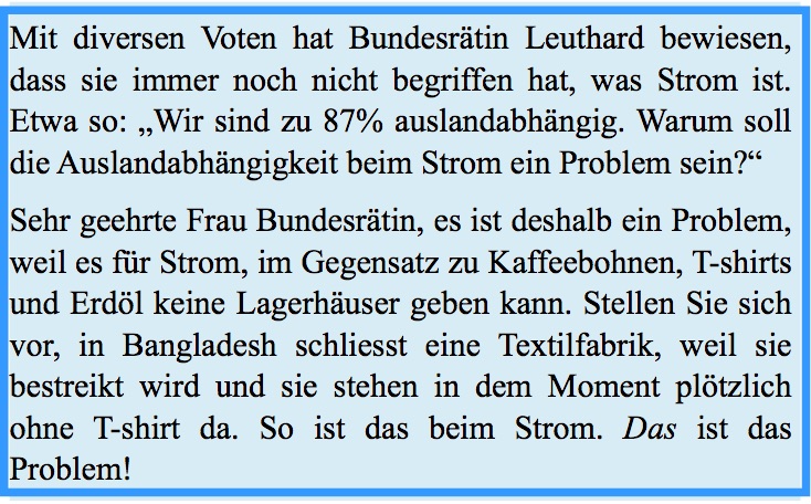Wie wichtig, zeigte sich in der Fragerunde nach BR Leuthards Plädoyer: NR Killer fragte sie, ob es denn zutreffe, dass das Verbot von Rahmenbewilligungen nur für die gegenwärtige Generation von Kernreaktoren gelte, wie ihr Amtsdirektor Steinmann öffentlich erklärte. Die Bundesrätin wirkte sichtlich irritiert und beantwortete die Frage indirekt: das Atomzeitalter sei ein für alle mal vorbei, sagte sie sinngemäss. Diese Meinung ist offenbar departementsintern nicht ganz unumstritten.