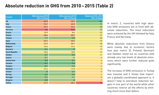 - Countries that have pragmatic yet ambitious climate and energy policies, such as the UK, are driving down their emissions. The UK has achieved the largest absolute reduction in GHG emissions in Europe from 2010-2015. Some Eastern Europe countries like Poland, Slovakia and Czech Republic, have also decreased their high emissions levels significantly in the recent years while growing their economies.