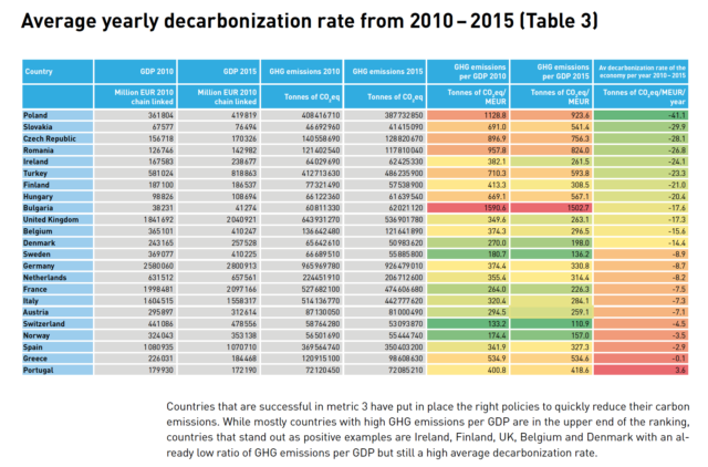 - Average annual decarbonisation rate from 2010 to 2015 measuring how fast countries are “greening” their economy (leader: Poland)